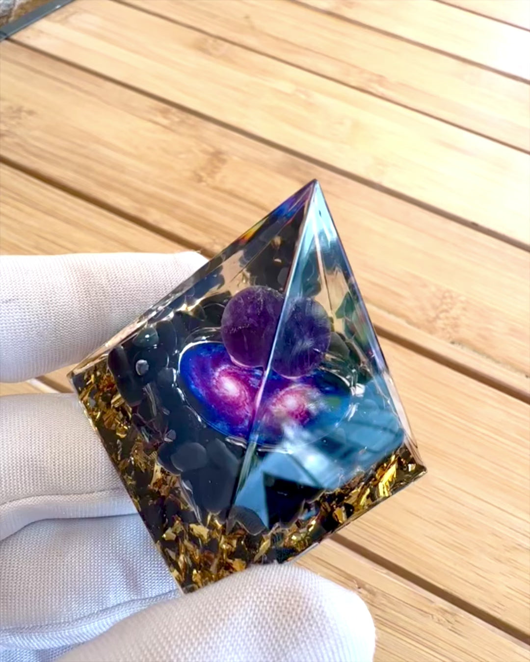 Vyrobená z nejkvalitnějších materiálů, pyramida kombinuje přírodní kameny a ametyst, který je známý svými ochrannými a léčivými vlastnostmi. Uvnitř se nacházejí zlaté třísky, které dodávají eleganci a symbolizují bohatství a hojnost.